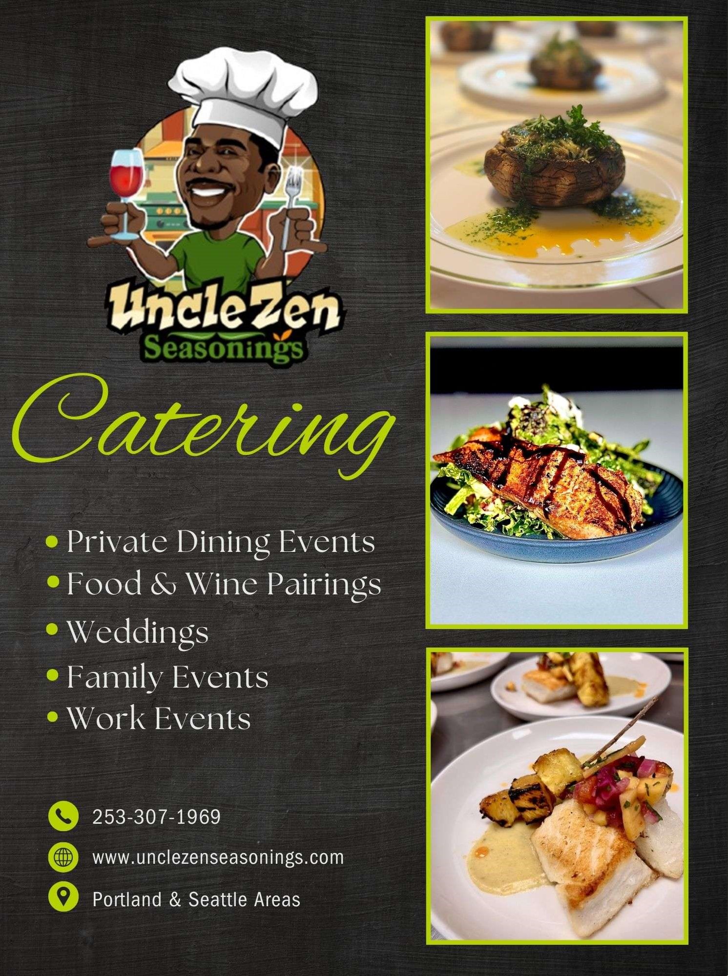 We believe every event deserves unforgettable flavor with a dining experience that feels just as special as the occasion itself. Turn your next gathering into a savory celebration with Uncle Zen Seasonings! We proudly offer private event catering in Portland, OR and Seattle, WA areas. Partner with us to bring handcrafted flavor and soulful hospitality to your friends, family, and coworkers. You can expect a custom menu seasoned with our signature blends, locally inspired dishes, and memories to last a lifetime!